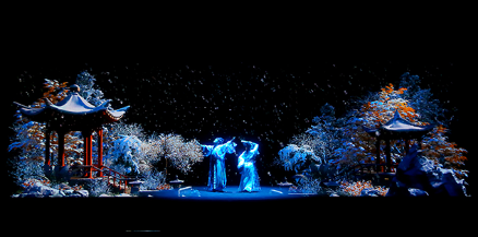 《梁山伯與祝英臺》的舞臺四面通透,觀眾從任何方向都可以看到舞臺上的場景。表演開始后,觀眾能觀賞到演員和舞臺場景神秘消失,四面墻壁在通透的舞臺上憑空出現,藤蔓植物墻壁快速生長,以及墻面碎裂、崩塌等震撼效果。同時,舞臺營造的風、雪、雷、電等天氣變化帶給觀眾最接近真實的觀感體驗表演接近尾聲時,梁山伯與祝英臺翩翩起舞,最后化身為美麗的蝴蝶飛入花叢凄美絢爛。整場表演看罷,如詩如畫。《梁山伯與祝英臺》就這樣以真實、夢幻、凄美的效果向觀眾訴說著“為愛化蝶”的千古愛情悲劇。